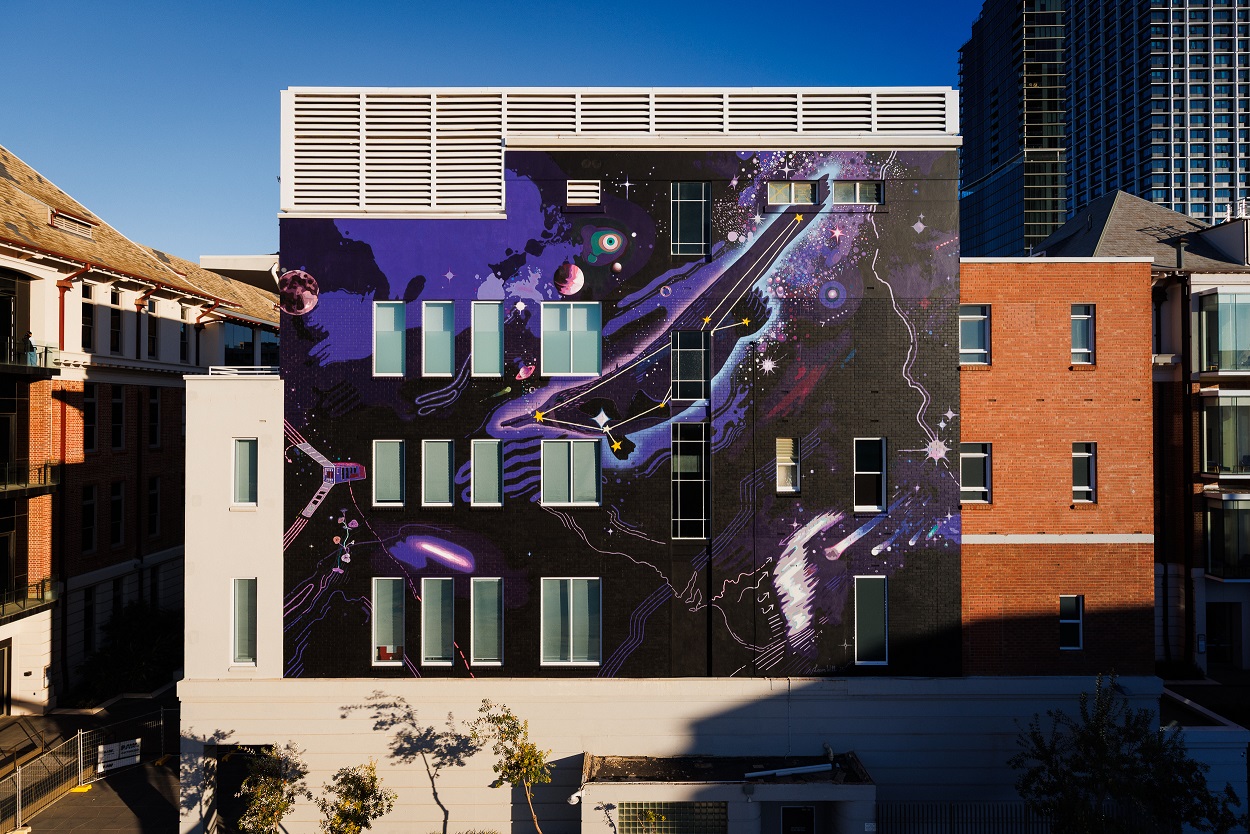 The mural is now open. To view the artwork visitors can enter Lot Fourteen via North Terrace and walk towards the back of the McEwin Building which houses the Australian Space Discovery Centre.
